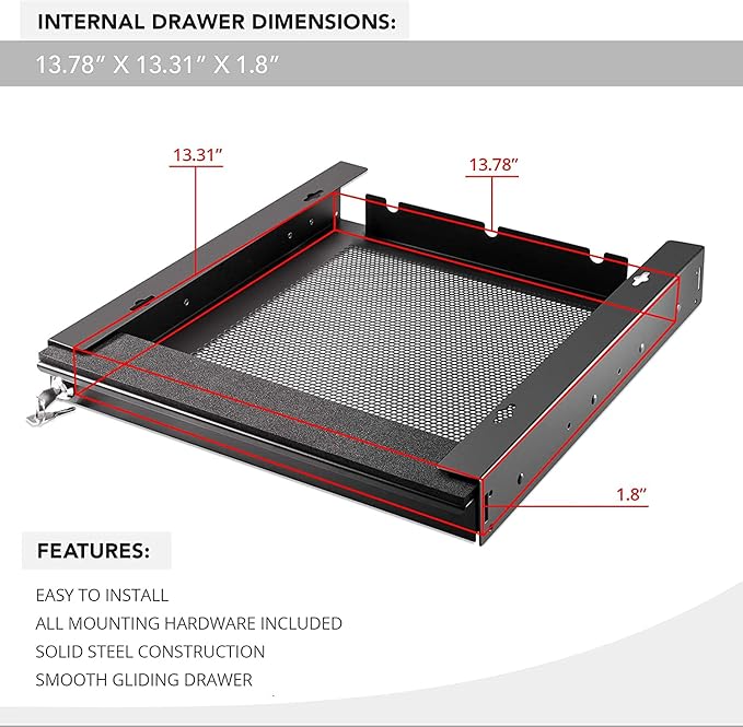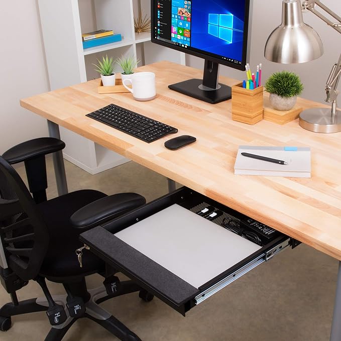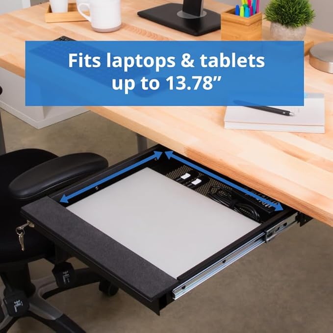 - ALWAYS KEEP YOUR LAPTOP SAFE: Ensure that your notebook computer is always where you left it with this under-desk organizer from Penn Elcom! This security drawer comes with 2 keys so that it is fully secured, and hidden out of sight when closed.