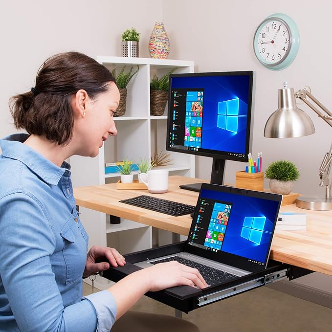- FAST AND EASY SET UP: This unique sliding laptop tray comes with all the mounting hardware you need to easily install the brackets on the underside of desks with strong, sturdy bolts. It can also be installed on other worktops that have a lip.