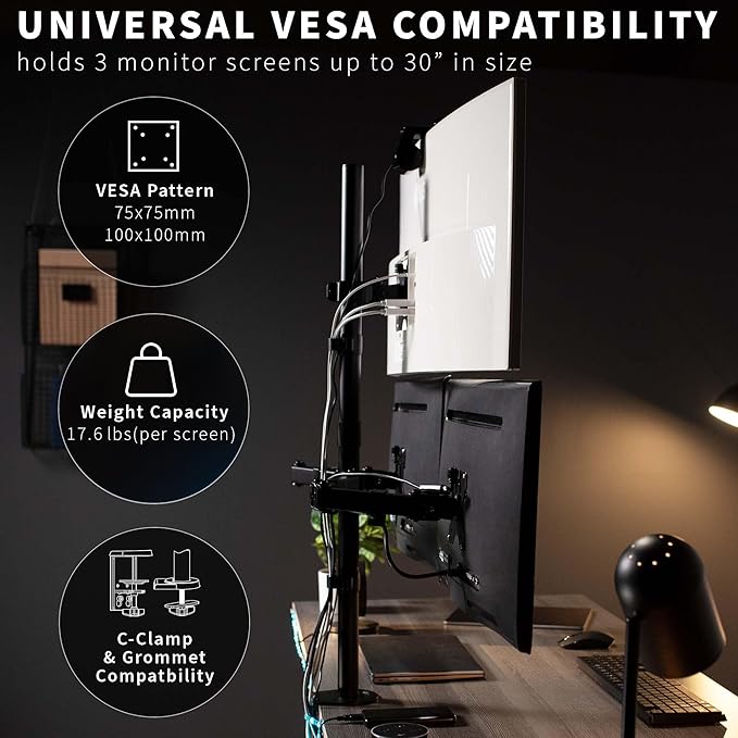 - Fits up to 30" Screens: This triple mount holds 3 screens up to 30" and 17.6 lbs each with 75x75mm and 100x100mm VESA mounting holes