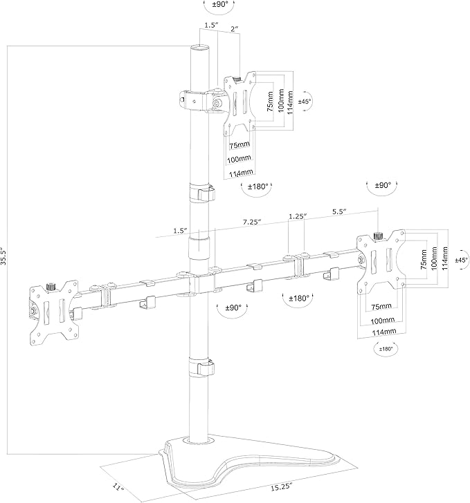 - Articulation & Height Adjustment - Adjustable arms offer +15° to -15° tilt, 360° swivel, 360° rotation, and height adjustment along the center pole for optimal viewing angles. Monitors can be placed in portrait or landscape shape.