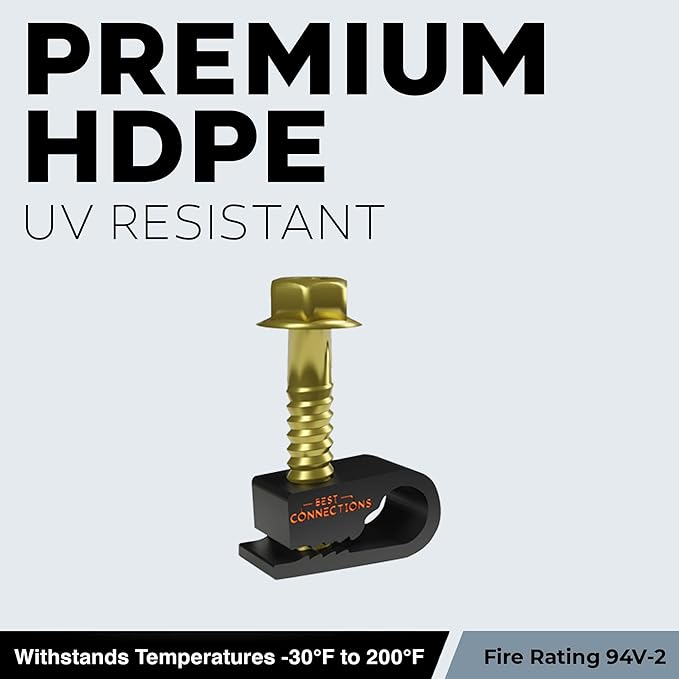 - HIGH QUALITY MATERIAL – Expertly crafted with high-quality, stabilized plastic and pre-inserted screws, our screw-in cable clips are highly resistant to breakage. Made of premium-grade UV protected High Density Polyethylene (HDPE), these clips offer excellent properties such as high impact strength and stiffness, outstanding formability, and superior performance in both high and low-temperature conditions. Approved by AT&T, DIRECTV and VIASAT.