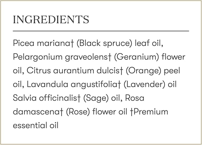 - Scent : Black Spruce, Geranium, Orange, Lavender, Sage, Rose