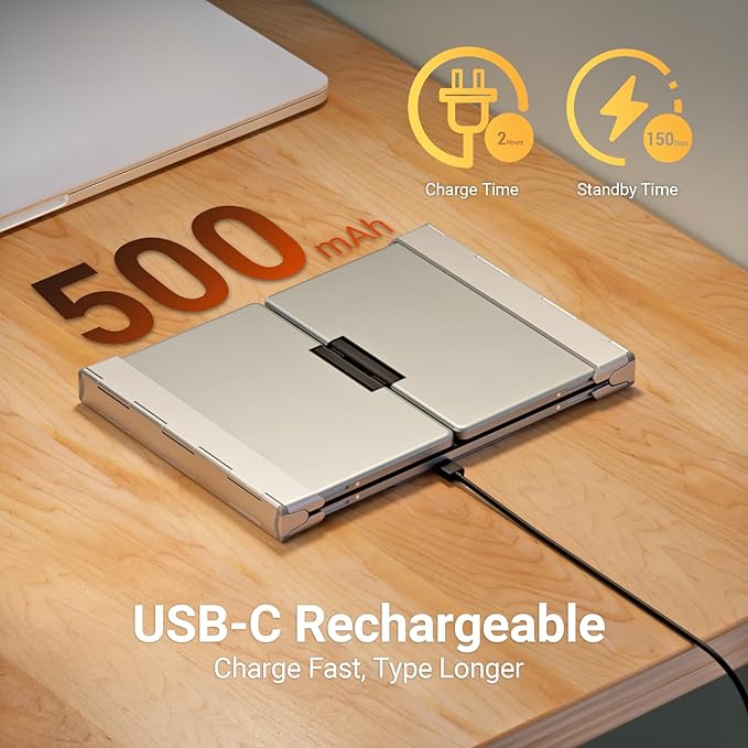 - USB-C Rechargeable - The foldable Bluetooth keyboard has a built-in rechargeable battery, a full charge lasts up to 5 months with usage of 2 hours daily without backlit. When the backlight is used, the power stays on for up to 5 hours. Ensuring the keyboard remains ready for use when you need it.