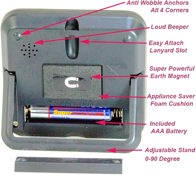 - Strongest Timer Magnet Listed Anywhere: Powerful Neodymium earth magnet & anti-scratch appliance saver foam. Our timers won't slide down your fridge or scratch appliances. Anti-Wobble Stabilizing Anchor Points: Designed on all 4 corners eliminating wobble, pivot, or movement when buttons are pressed while magnet secured. What good is a timer you can’t use while attached? This timer won't pop off your range hood and backflip into your boiling soup because you hit the off button. "No soup fer yu"