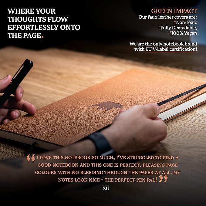 - A4 NOTEBOOK WITH LOTS O' FEATURES: Dingbats notebooks ooze quality - this hardcover bound leather notebook is crafted with PU vegan leather, micro-perforated cream 100gsm pages, an elastic closure and pen holder. It's complete with animal footprint end sheets, and an inner pocket for a little added detail - the perfect gifts for men and women, these travel essentials are a gift that keep on giving