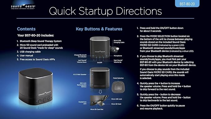 - Includes 20 built-in made for sleep sounds. Sounds play seamlessly for 8 hours. Bluetooth stream sounds/music or use Free Included Sound Oasis App's.