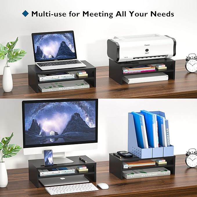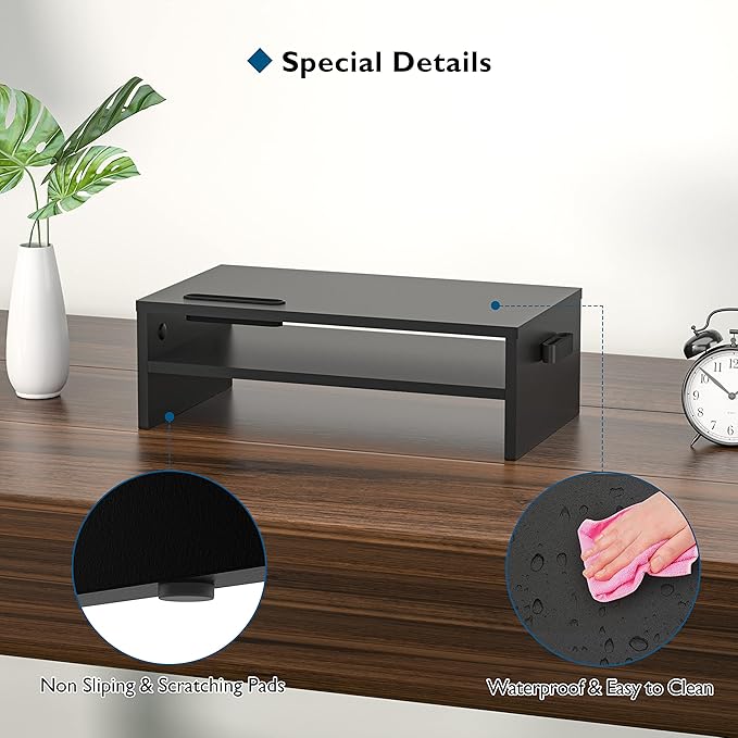 - MONITOR STAND WITH STORAGE ORGANIZATION FEATURES - This two-tier monitor stand provides ample storage for your laptop, keyboard, mouse, and other accessories. The built-in cellphone holder and cable management slots help keep your desk tidy and organized