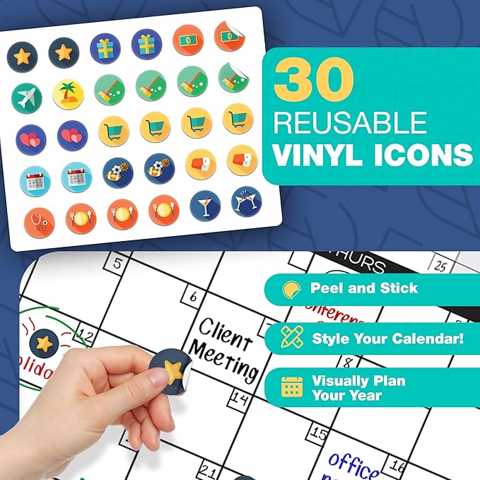 - All-In-One Package: Equipped with all the necessary accessories, our calendar comes with everything needed for immediate use. Enjoy high-quality markers, eraser, spray bottle, durable push pins, and reusable icons. Our comprehensive package ensures you have all the essentials for an organized start.