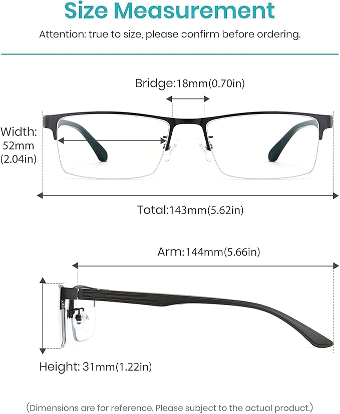 - 【GLASSES SIZE】Lens width: 2.04 inches; Lens height: 1.22 inches; Bridge: 0.7 inches; Arm: 5.66 inches