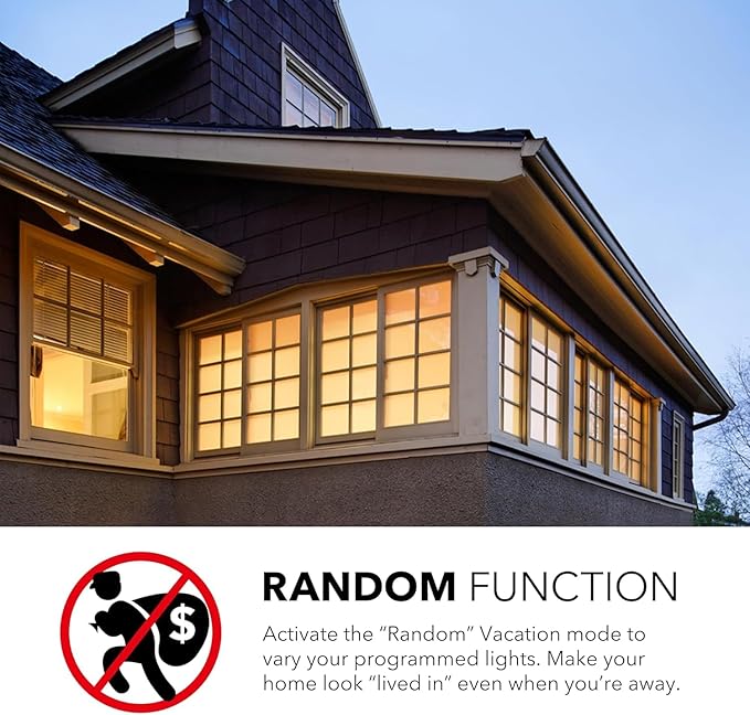 - 【Random Mode to Protect Your Home】Activate the “Random” Vacation mode to vary your programmed lights, giving your home a “lived-in” look even when you’re away. Switch to Daylight Savings mode with the press of a button.