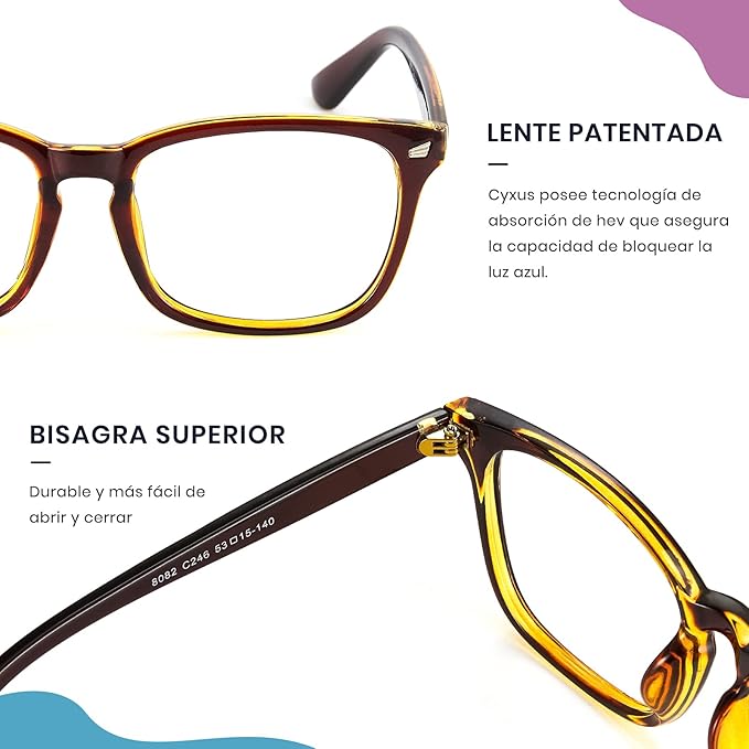 - GLASSES MATERIAL:Cyxus blue light blocking glasses is made in lightweight Polycarbonate square frames and PC Lenses. Our clear PC lens is 30% lighter than resin lens and 50% lighter than glass lens. At the same time, PC lenses are safer than glass lenses. Its impact resistance is 60 times that of glass lenses and through the falling ball impact test, the lens is not easy to break