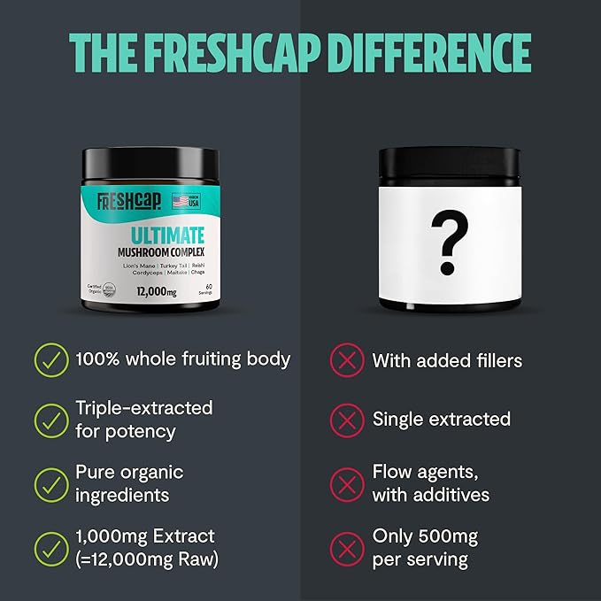 FreshCap Mushrooms Ultimate Mushroom Supplement Powder 12,000mg - Nootropic Organic Mushroom Complex for Focus & Memory, Brain Support Supplement, Ayurveda Mushroom Powder Extract (60 Servings)