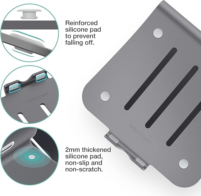 - Considerate Design Silicone pads on the top surface, front lip and at the bottom to hold your laptop stable in place and maximum protect your device from any scratches and sliding. The heat conduction alloy and ventilation hollow design, prevent it from overheating and keep your notebook cooling.