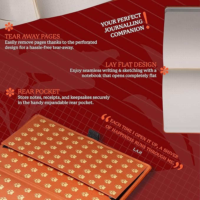 - A5 NOTEBOOK WITH LOTS O' FEATURES: Dingbats hardcover bound PU vegan leather journal contains micro-perforated cream 100gsm paper, elastic closure, pen holder; complete with animal footprint end sheets, and an inner pocket