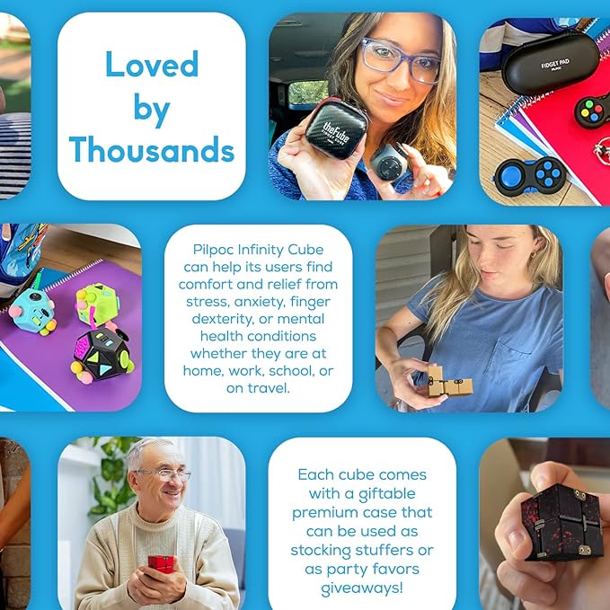 - REDUCE STRESS, ANXIETY, FOR ADHD: PILPOC theFube Infinity Cube Magic Fidget Cube desk toy has been designed to help people relieve stress and anxiety. It helps students focus, it is relaxing for people with ADHD, it helps seniors improve manual dexterity, and it even helps quitting smoking or biting the nails.