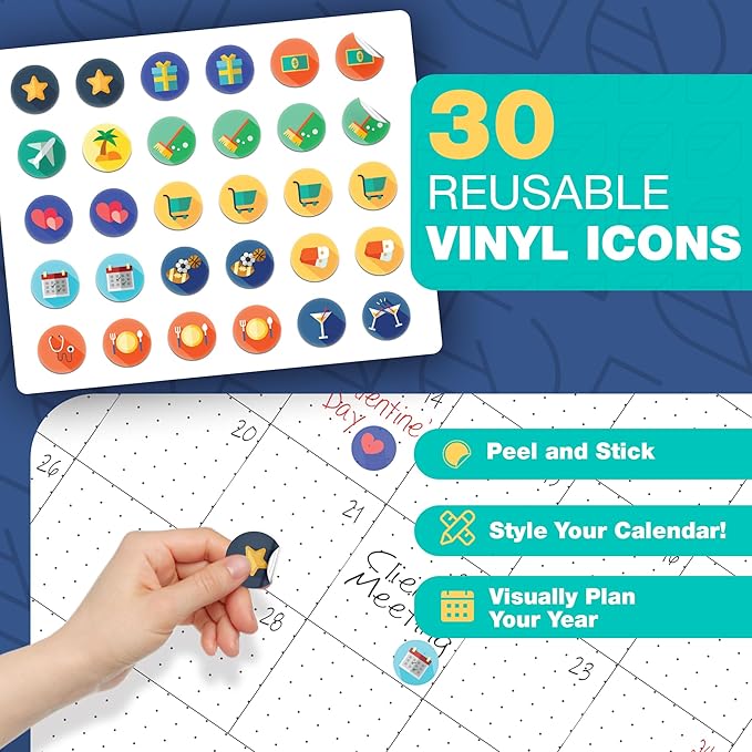 - All-In-One Package: Equipped with all the necessary accessories, our calendar comes with everything needed for immediate use. Enjoy high-quality markers, eraser, spray bottle, durable push pins, and reusable icons. Our comprehensive package ensures you have all the essentials for an organized start.