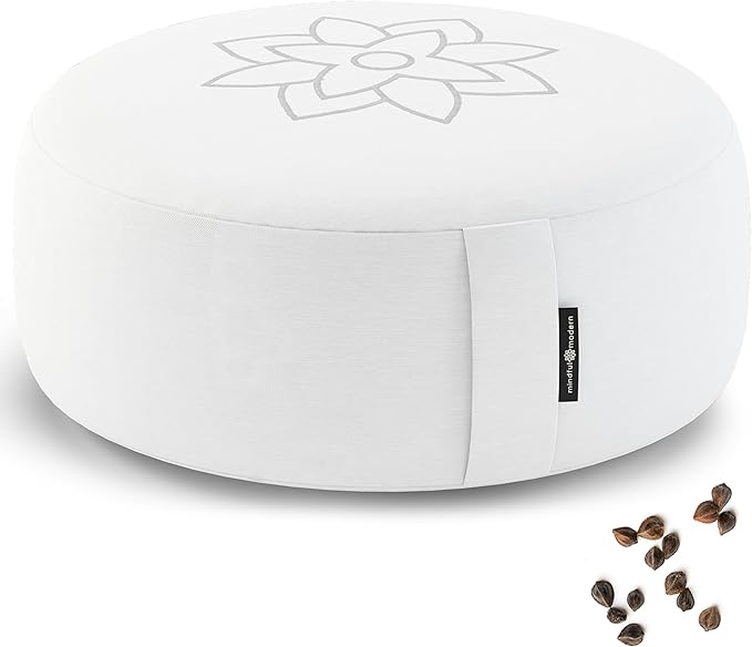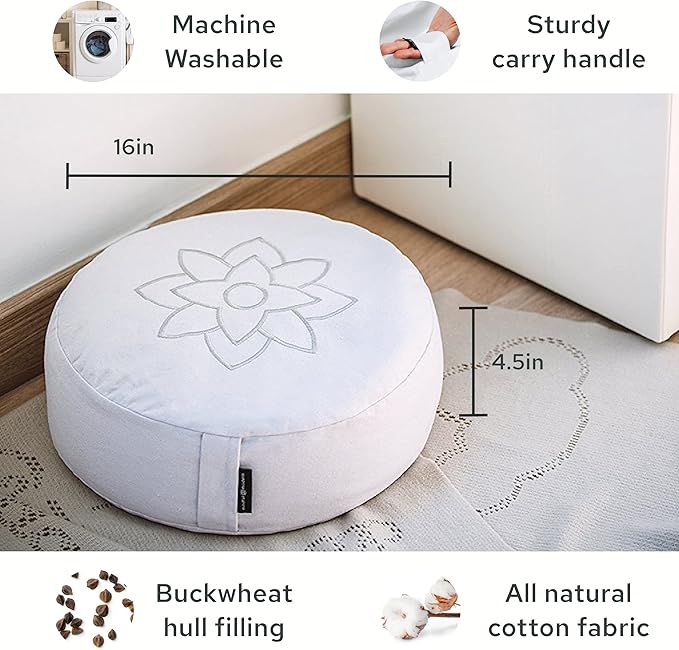 - NATURAL AND SUSTAINABLE MATERIALS - Our 16'' x 4.5'' floor bolster is filled with 100% natural buckwheat hulls and then covered with organic cotton. The cover on our yoga seat has a subtle zipper, allowing you to adjust the filling to your desired comfort level. The stylish round shape has extra legroom for deep meditation.