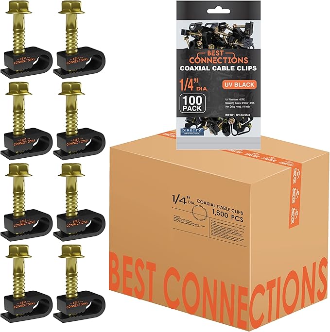 - HIGH QUALITY MATERIAL – Expertly crafted with high-quality, stabilized plastic and pre-inserted screws, our screw-in cable clips are highly resistant to breakage. Made of premium-grade UV protected High Density Polyethylene (HDPE), these clips offer excellent properties such as high impact strength and stiffness, outstanding formability, and superior performance in both high and low-temperature conditions. Approved by AT&T, DIRECTV and VIASAT.