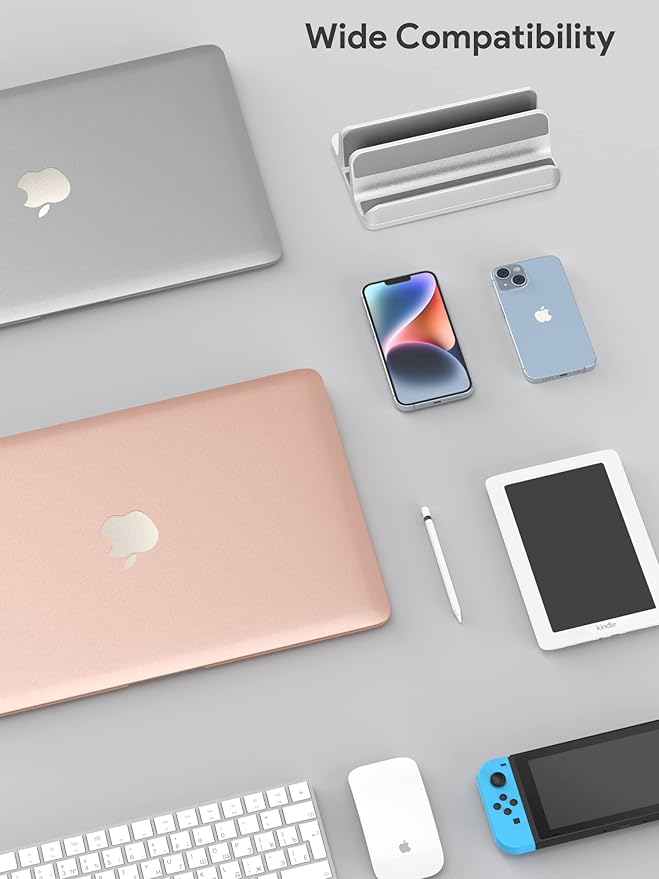 - Space-Efficient 2-in-1 Design: This vertical laptop stand cradles a laptop/pad, phone, and pen simultaneously. The laptop rack optimizes your desktop space, keeping it well-organized and tidy. An excellent space-saver, it utilizes vertical space effectively for a clutter-free workspace.