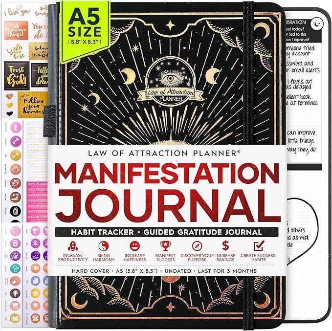 - MANIFESTATION JOURNAL - This deluxe daily planner and self-care journal comes in A5 size (5.8 x 8.3 inches). The life planner comprises 264 pages of thick 100 gsm paper, including 90 daily planning sheets, guiding you on how to become the best possible version of yourself on a mental, physical, and interpersonal level. It's a unique diary based on leading scientific studies proven to increase productivity and happiness. The journal features an out-foldable vision board to help you stay focused, morning and evening power questions, mind maps, reflection pages, habit trackers, a back pocket, and much more than any other planner on the market!