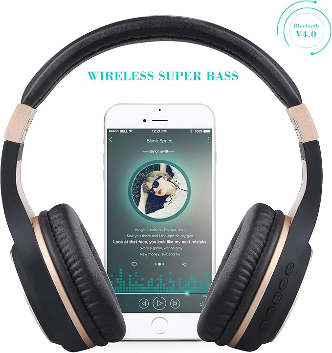 Riwbox Bluetooth Headphones, XBT-80 Folding Stereo Wireless Bluetooth Headphones Over Ear with Microphone and Volume Control, Wireless and Wired Headset for PC/Cell Phones/TV/iPad (Black Gold)