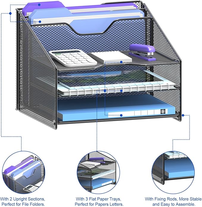 Samstar Desk File Organizer, Mesh Letter File Folder Holder with 3 Paper Trays and 2 Vertical Upright Section, for Office Supplies,Desk Accessories & Workspace,Black.