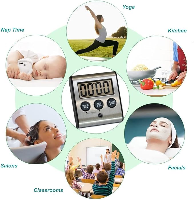 - (6 Pack) - 2025 Model: "Great Little Timer" We eliminated the annoying little button beeps every time buttons are pressed. New lanyard attachment feature for hanging timer around neck belt or wrist. Adjustable angle fold-out countertop kickstand. Counts up/down 99 min/59 sec w/ Auto-Memory for repeated tasks. Auto-Memory holds previous setting for the next event. Want 3 min eggs every morning? Set time once and only press start every morning. 3 min. will stay in memory until reset.