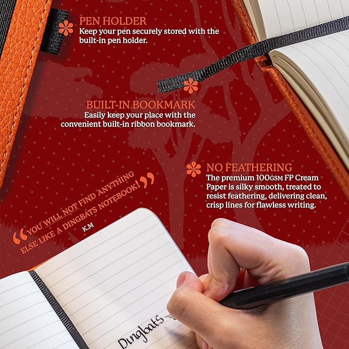 - A6 NOTEBOOK WITH LOTS O' FEATURES: Dingbats notebooks ooze quality - this hardcover bound leather notebook is crafted with PU vegan leather, micro-perforated cream 100gsm pages, an elastic closure and pen holder. It's complete with animal footprint end sheets, and an inner pocket for a little added detail - the perfect gifts for men and women, these travel essentials are a gift that keep on giving