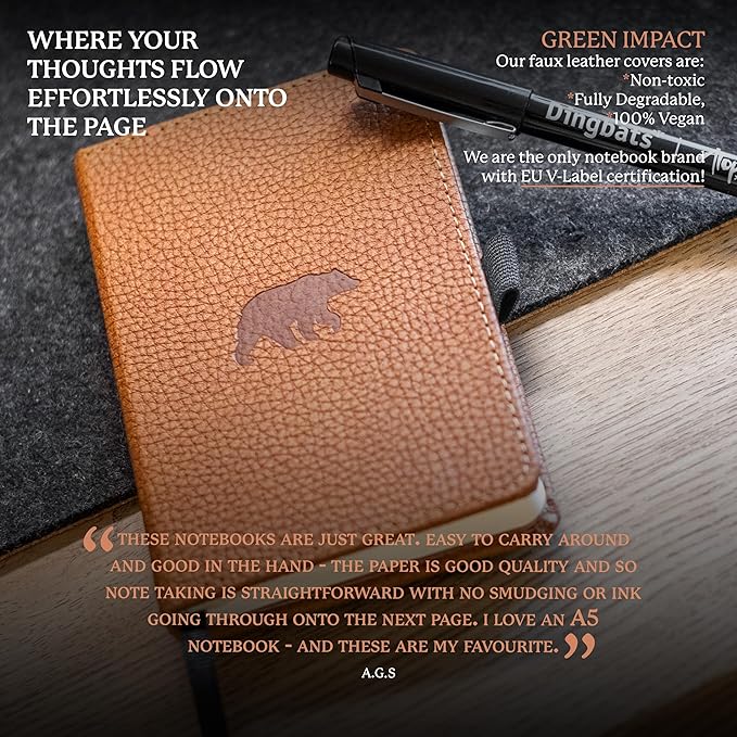 - THE ONLY VEGAN CERTIFIED NOTEBOOK: Made from recyclable materials and purely FSC certified paper, this handsome blank journal is 100% Vegan Certified! We wear this badge with honour, and hope you join our pledge to make the environment a better place, one Dingbats pocket notebook at a time! For its UK sales, Dingbats* Notebooks Ltd donates 2% of its revenue to WWF-UK, a charity registered in England and Wales (1081247)