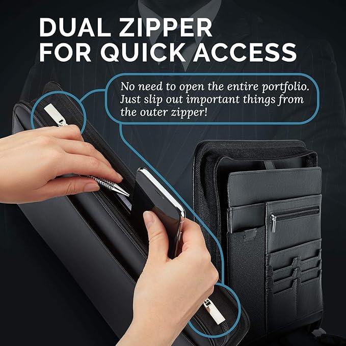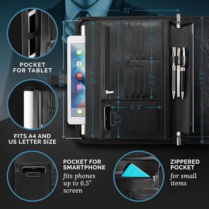 - ππΌ DESIGNED TO PERFECTION - STAY NEAT & ORGANIZED: This neat leather notepad holder Itβs has a dual zipper for extra convenience & accessibility, 12 convenient interior pockets plus 1 exterior pocket for documents, including 6 business card holders, a zippered pocket for extra safety, 2 pen holders, one of which is big enough for 1 large or 2 standard pens, special-made padded universal 12.5-12.8in sleeve for iPad / tablet, phone sleeve big enough for the largest iPhone/phone & much mor