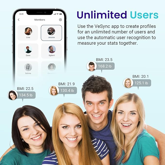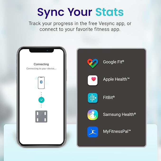 - Weigh Smarter: Pair your scale with the free VeSync app via Bluetooth, to easily track daily/weekly/monthly progress and gain insight into your fitness routine. Rest assured, VeSync will not share your personal information with any third parties