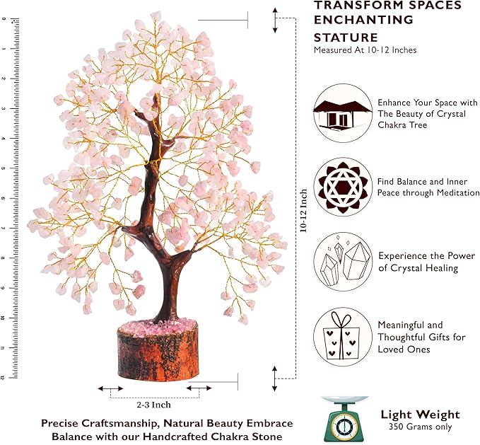 - Feng shui tree specification: Rose quartz tree figurine made from the beautiful small crystal beads rose quartz crystals and golden wire with the approximate size 10-12 Inch which is good for spiritual decor, chakra decor, rose quartz decor, room decor, gifting purpose etc. The rose quartz crystal décor tree is crafted by the skilled artisans in INDIA who gave a beautiful look to the feng shui tree. Rose quartz stone tree good luck gifts because its symbol of love & happiness.