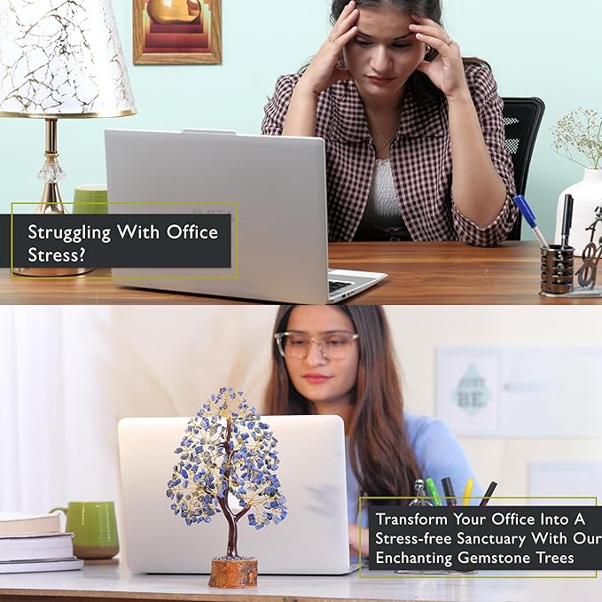- Chakra tree specification: Lapis lazuli gemstone tree figurine made from the beautiful small lapis lazuli crystal beads and golden wire with the approximate size 10-12 Inch which is good for feng shui decor. The good luck prosperity stones tree is handmade is INDIA, come with the premium box packaging which you can easily use as a gifting purpose also. Lapis lazuli tree perfect for office decor men, blue office decor. Gem tree made with meditation crystal also good for yoga room decor.