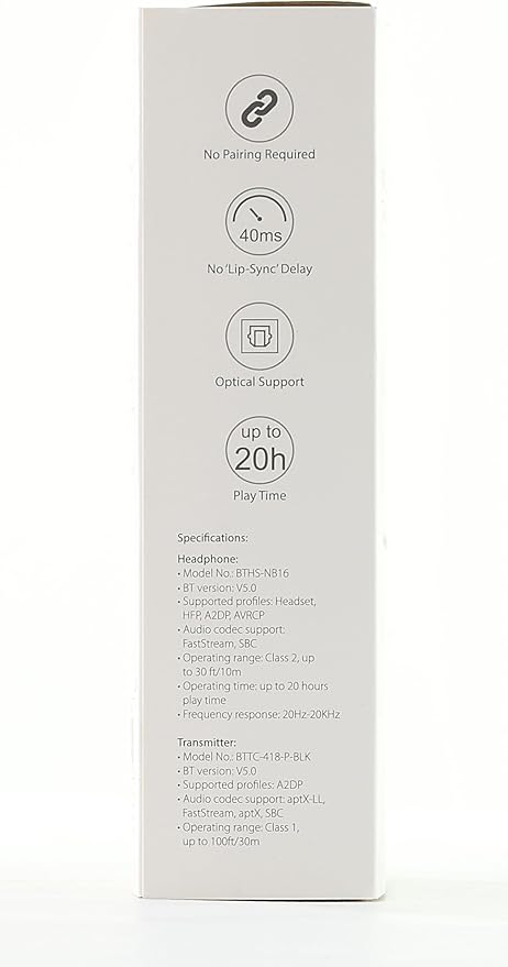 - [Add a 2nd Headphone] The HT4186 supports dual-link audio and allows you to add a 2nd pair of Bluetooth headphones to it. We highly recommend using a headphone that supports FastStream Bluetooth (e.g. Avantree Aria) for the best no-audio-lag experience. (Note: Audio may become off sync if you use a non-FastStream device).