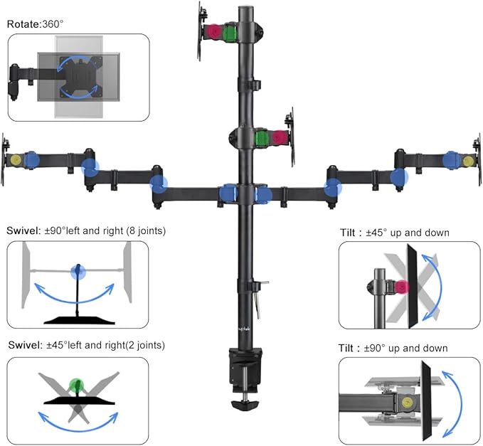 - Fully aticulation - Rotate 360°, tilt ±90° up and down, swivel ±90° left and right (middle plates tilt ±45° up and down, swivel ±45° left and right), extra tall height adjustment along the center pole.