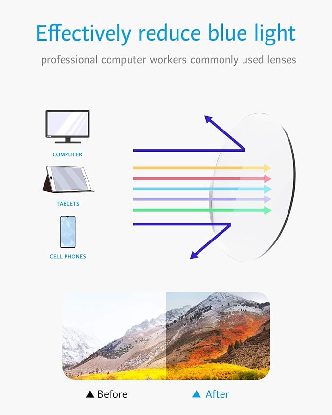 - ANTI BLUE LIGHT: Cut 90% of the blue light. Relieving eye fatigue, dry and vision falling