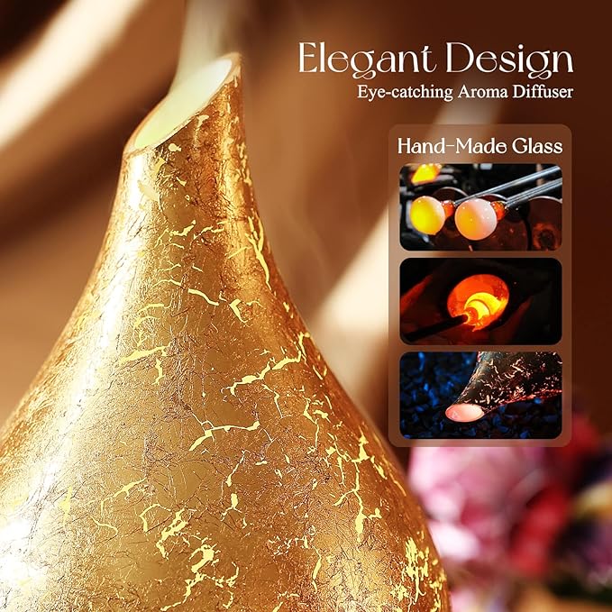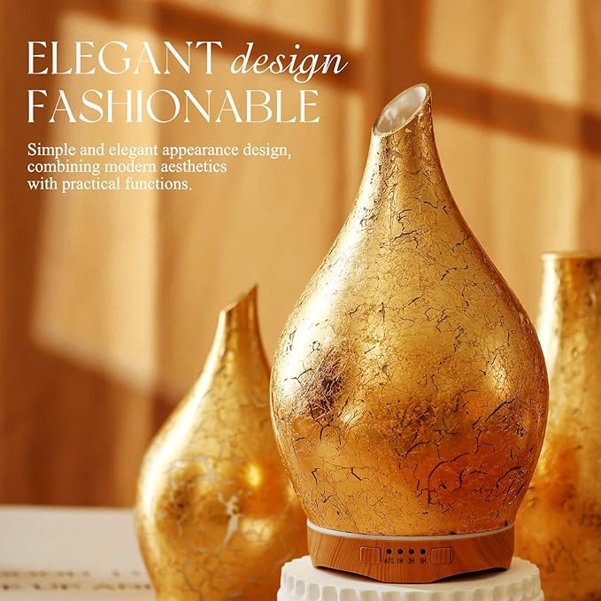 - UNIQUE DECORATIVE AROMA DIFFUSER - Our 280ml glass essential oil diffuser has an hand blown glass with a elegant gold leaf feature and wood grain decorative base. It is very suitable for your bedroom, living room, children's room, study room, office and yoga room.