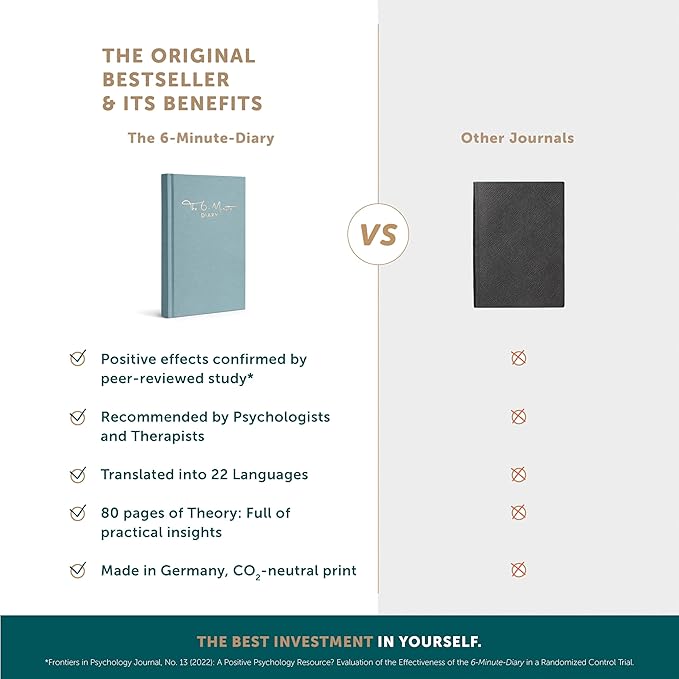- ✅JOURNALING MADE EASY with Proven Techniques: Don’t know where to start? The 6 Minute Journal is the world's most beloved guided journal for a reason! All the journal prompts are backed by the proven principles of positive psychology. This undated self care journal allows you to begin whenever you’re ready!