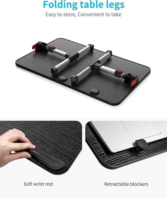 - Ergonomic Design Bed Desk - Soft wrist rest pad provides your wrist a comfortable place. The retractable blocker protects your computer from falling down. 5 adjustable heights(9.4"-12.6") and 4 adjustable angles (0-36°) provide you a more comfortable posture and avoid back & neck pain.