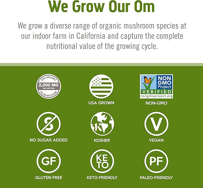 - USA Grown the Om Way: Om Mushroom Superfood Powders, Capsules, Hot Drinks, Energy Drinks and Broths are all produced in the USA. We grow, dry and mill our organic mushrooms into powders in our state of the art facilities in Southern California, to ensure the highest quality, and verify using 3rd-Party Testing. Om Mushroom capsules are non-GMO, gluten-free, vegan, grown in the USA, paleo-friendly, keto-friendly, kosher