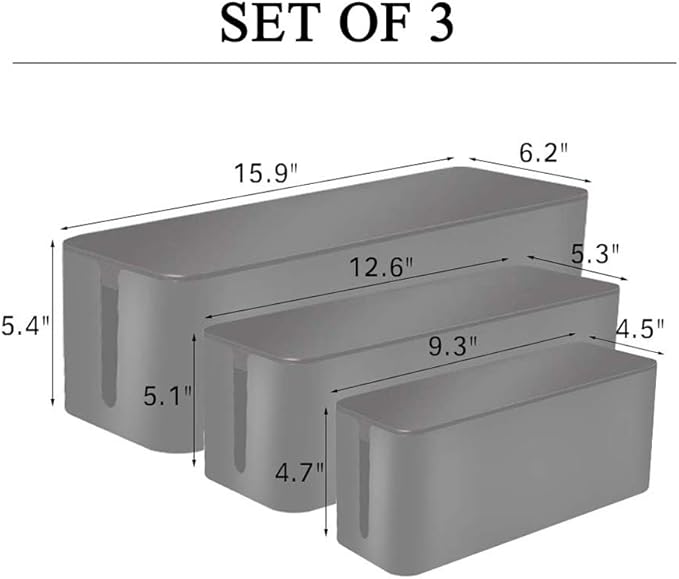 - SET OF 3 DIFFERENT SIZES - Large(15.9" x 6.2" x 5.4"), Medium(12.6" x 5.3" x 5.1") and Small(9.3" x 4.5" x 4.7"). Store all the outlet apparatuses including multiple power strips, cords, adapters, splitters, etc.
