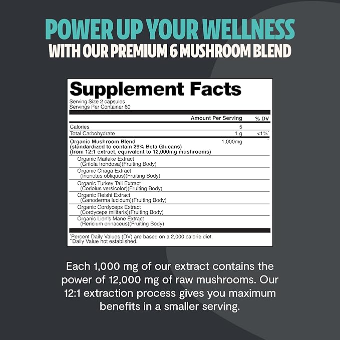 - NATURAL SIX MUSHROOM COMPLEX - A powerful mushroom supplement featuring Lion's Mane, Reishi, Cordyceps, Chaga, Turkey Tail, and Maitake works in synergy for complete health. Our mushroom complex capsules deliver 12,000mg raw mushroom equivalent per serving for maximum potency.