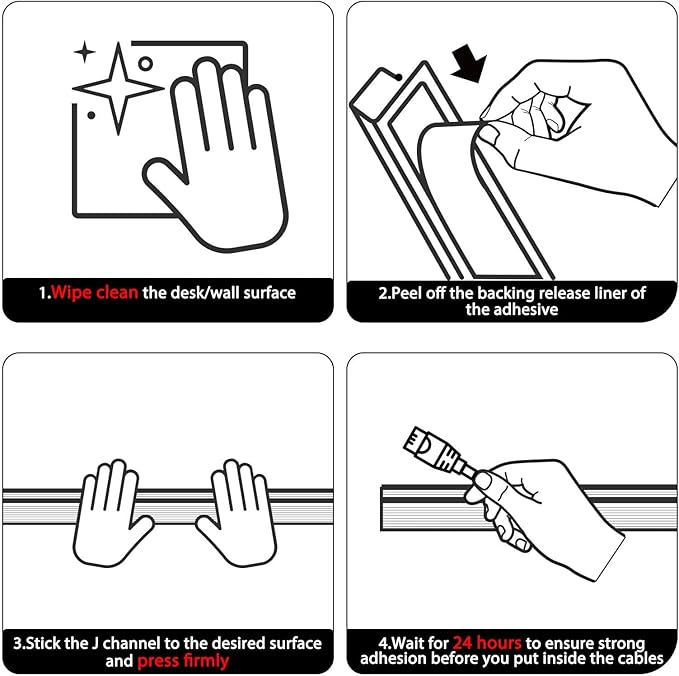 - Flexible Placement, Multiple Applications - Whether hiding wires under a desk or organizing cables alongwall, the J channel desk wire management offers diverse placement options. Installation is straightforward: choose a spot, peel off the film, and press the J channel pc cable management firmly onto the desired location. Let the J channel desk cable organizer set for 24 hours for a strong bond. Note that powder walls or uneven surfaces may hinder tape adhesion