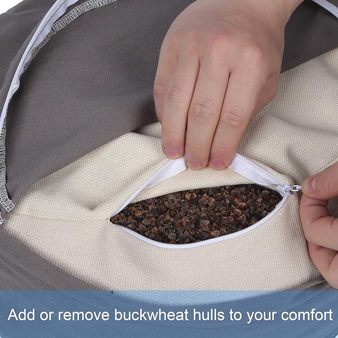 - HIGH QUALITY. The treatment of dehydration, high temperature washing and ultraviolet fumigation ensures natural buckwheat hulls are low water content, clean and flour free. 10oz encrypted canvas cover is soft and durable, which is also shrink free and fade resistance. Inner case cover of grey fabric is sturdy.