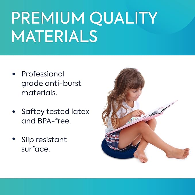 - DESIGNED FOR KIDS – Measuring 10.75” in diameter and 2.5” in height, the small wobble cushion for kids conforms to a child’s body and chair, unlike standard adult size discs. The inflatable wobble cushion is specially designed for young kids aged 3-7.