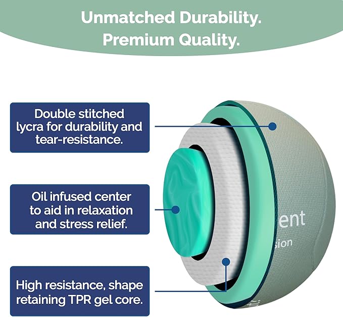 - Premium quality, ultra durable, larger sizing- Our ergonomic stress relief ball is made of a tear resistant gel core and sleek non-slip and non-stock fabric. Our inner core gel is oil infused with stimulating scents to aid in mindfulness, relaxation and stress relief.