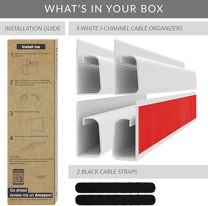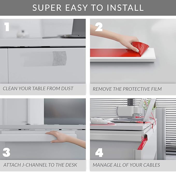 - Wires Are Completely Hidden: Your new cable management kit hides all messy wires from view, leaving behind a neat and tidy desk. The J Channel Raceway kit includes 4x 16” (41cm) white cable raceways, 2 straps, and 4 super strong mounting tapes – the perfect set for an office desk.