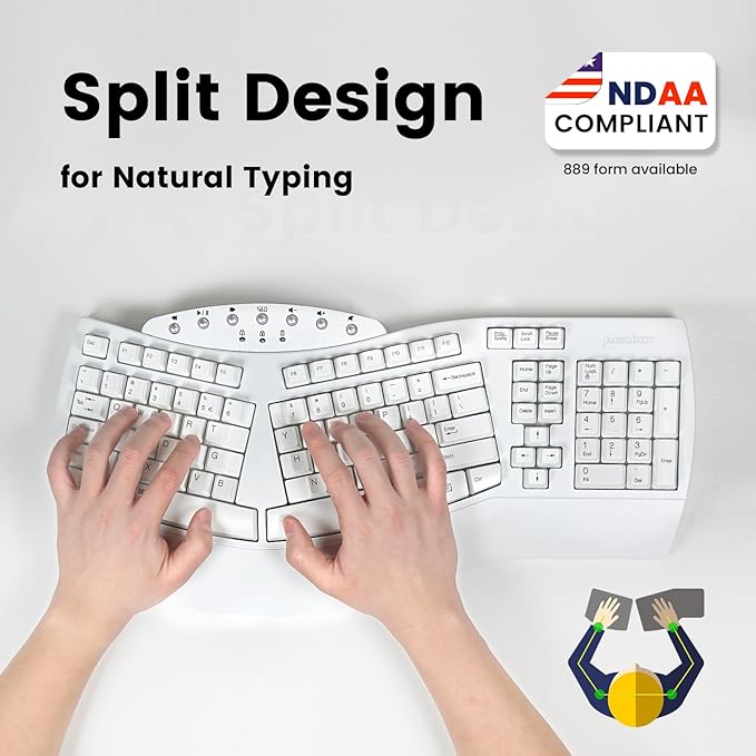- Ergonomic Split-Key Design - Integrated palm rest supports your wrists, releases median nerve pressure and reduces forearm tension; Natural arm and hand position while typing minimize chances of RSI, carpal tunnel syndrome