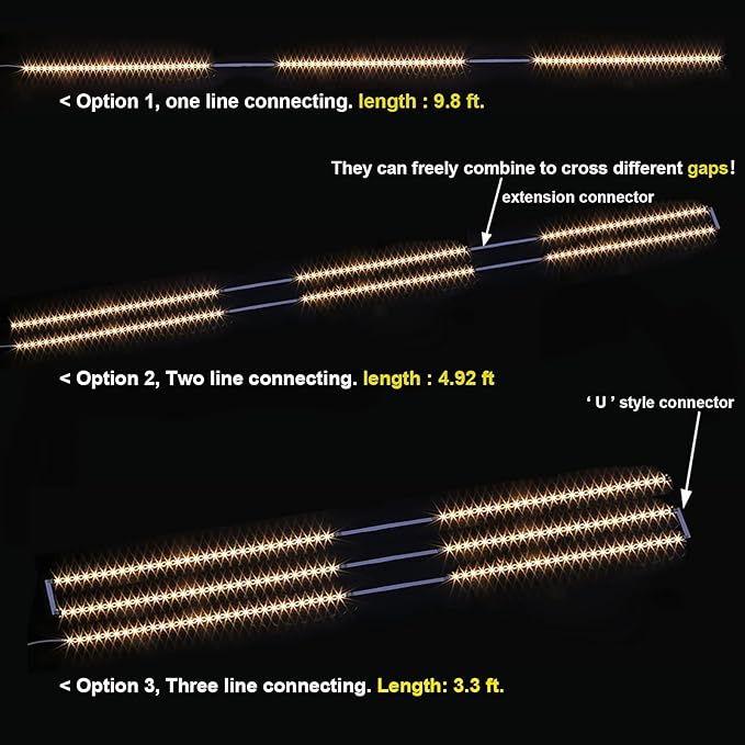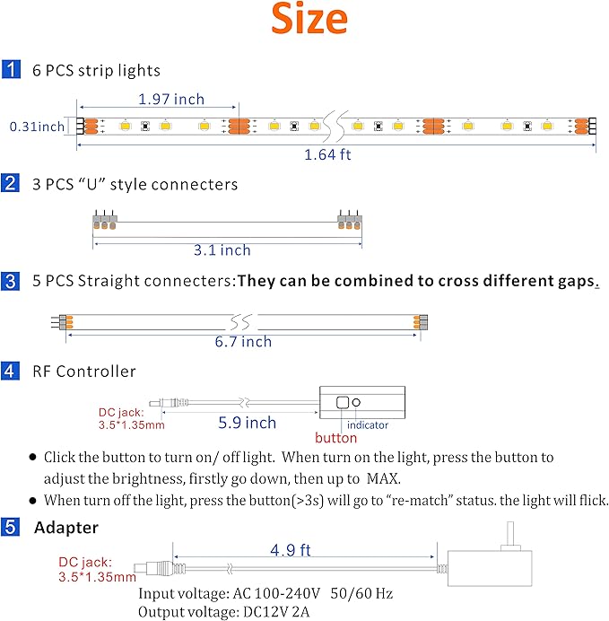 - DIY LED light strip: 6 PCS pre-cut strips, total 9.8 ft,many kinds of connection option,Great way to upgrade your cabinets,closet,desk,bookshelf,bed,wardrobe,display case,bedroom,workbench etc