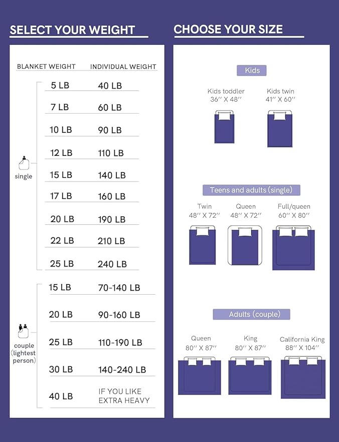 - [Sizing Guide] To choose a size for 1 adult, take 10% of your body weight, then add 1 lb, Please select a weighted blanket measuring 80x87 inches or 88x104 inches for sharing.